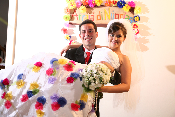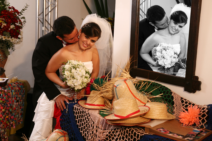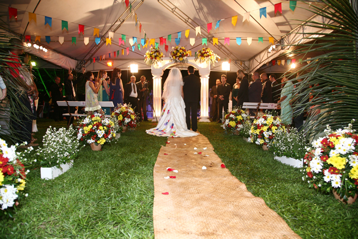 A assessora de imprensa Marla Barata, 31 anos, e o empresário João Paulo Brandão, 31, decidiram fazer o casório em meio a uma festa de São João, em um sítio em Lauro de Freitas. Foi lá que Marla se acostumou a ver o pai fazendo uma grande festa junina, todos os anos. Mas pouco antes de o casal formalizar o noivado, o sítio foi colocado à venda. “Então, tive a ideia de fazermos a última festa de São João da casa. Mas, desta vez, com um casamento caipira de verdade, com padre e certidão”, brinca. Assim, eles conseguiram se despedir da casa com um casamento diferente e descontraído.