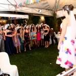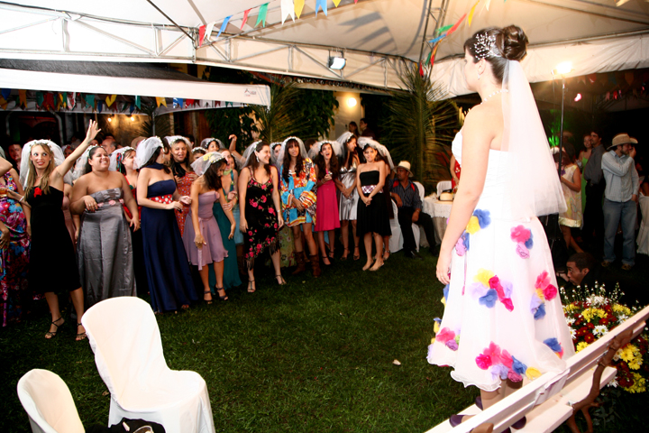 O convite sugeria que as pessoas usassem um traje “caipira chique”. Ainda assim, para garantir que ninguém ficasse de fora, os noivos foram prevenidos: logo na entrada da festa, chapéus, flores de papel e maquiagem foram disponibilizados em uma penteadeira para os convidados. “Eu e o noivo usamos roupas tradicionais com um toque caipira. Depois, troquei a saia longa do vestido de noiva tradicional por uma saia mais ‘noiva caipira”, lembra Marla.